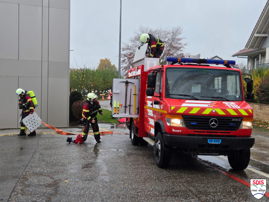 Au Collège du Marais 1, le premier chantier mettait en scène un feu de chaufferie, mobilisant le véhicule Tonne-pompe 3000 Etraz 123, le véhicule échelle automobile Etraz 112 ainsi qu’une remorque à tuyaux. À la caserne de Gimel, c’est une démonstration d’un feu de halle industrielle qui était simulé, permettant d’observer l’engagement de véhicule Tonne-pompe 1000 Etraz 421 de Gimel. Enfin, à la rue des Sept-Fontaines, un accident de la circulation avec feu de véhicule complétait le dispositif, impliquant le véhicule Tonne-pompe 1000 de Bière Etraz 321 et les services d’ambulance de manière collaborative.