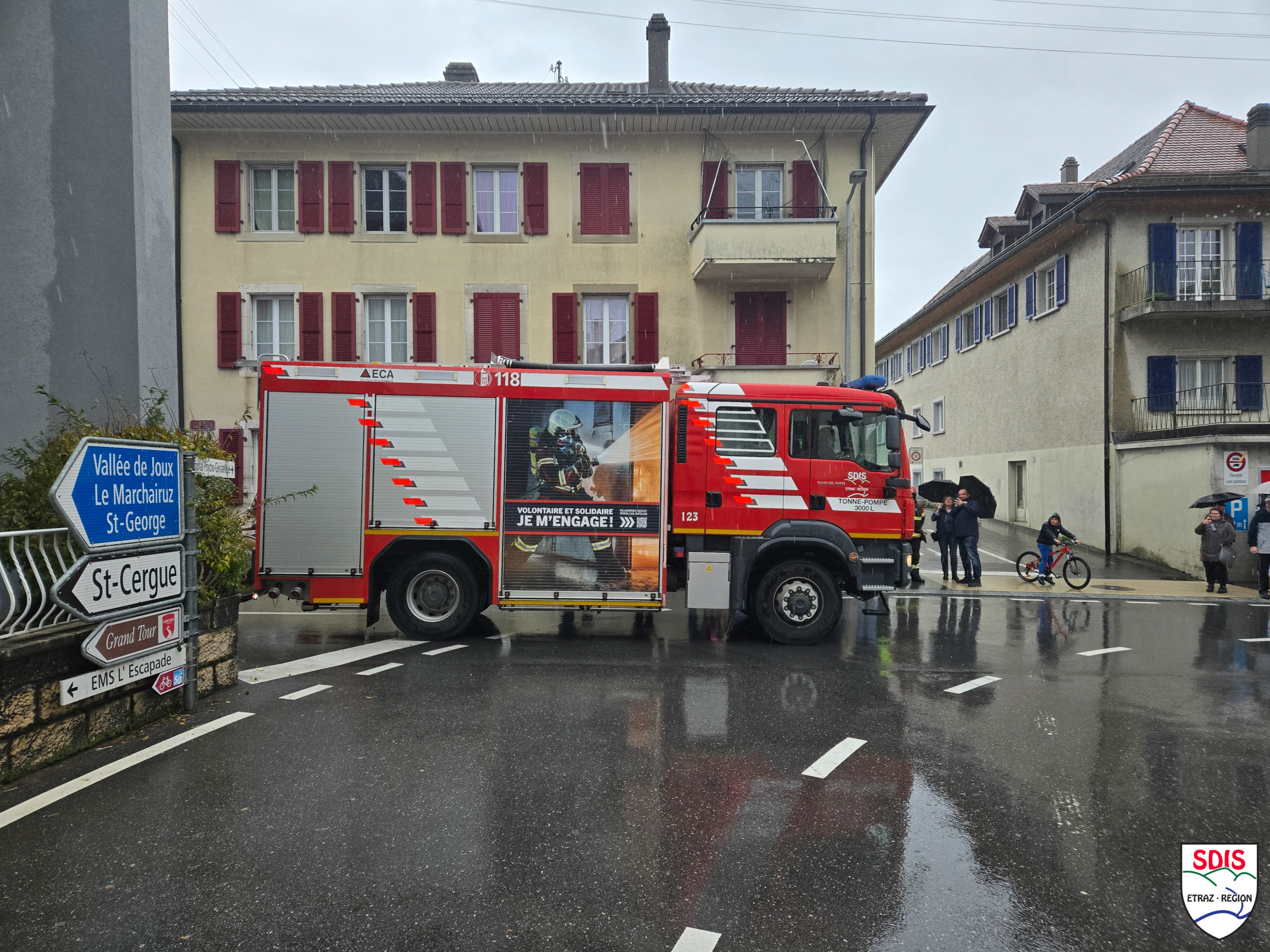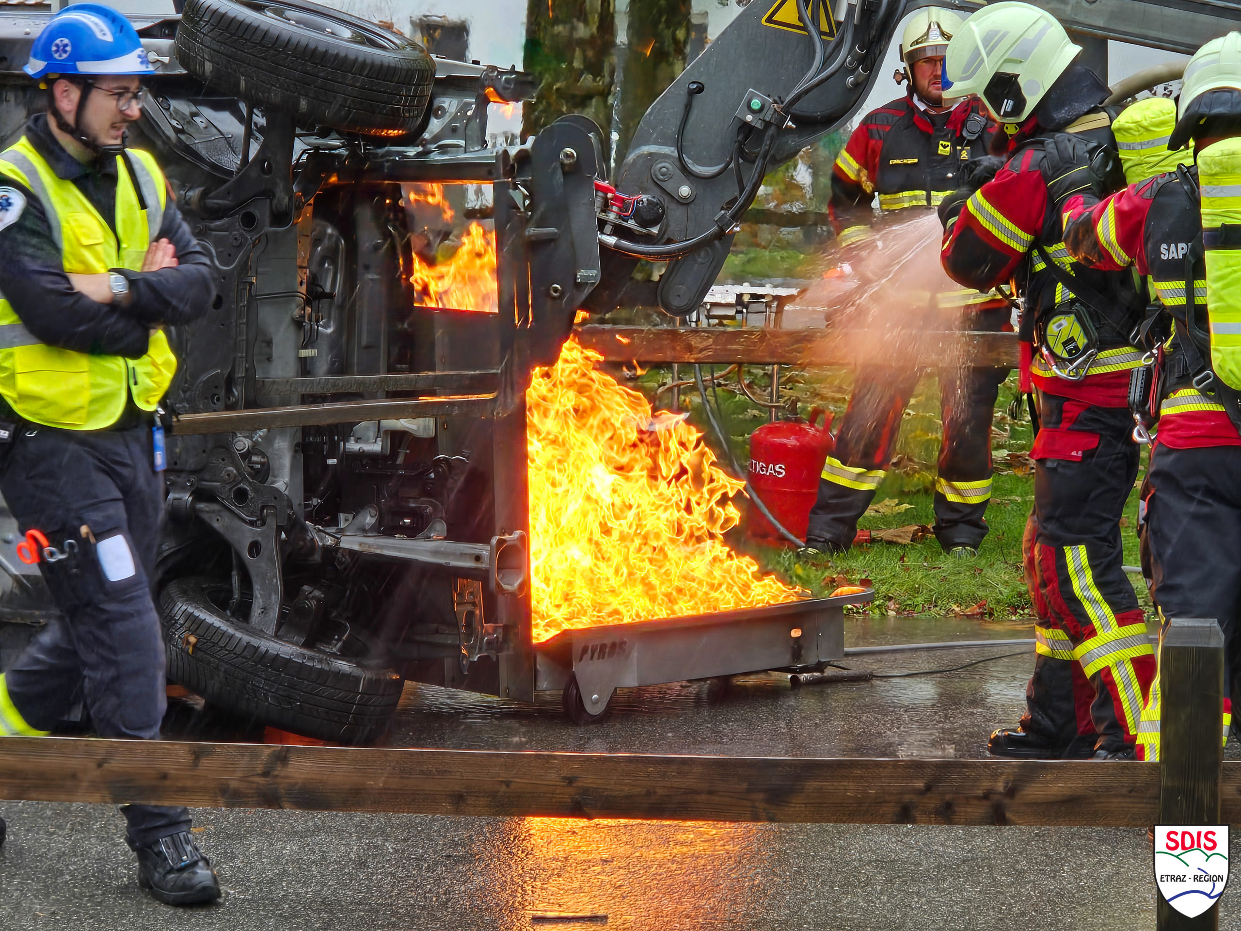 Au Collège du Marais 1, le premier chantier mettait en scène un feu de chaufferie, mobilisant le véhicule Tonne-pompe 3000 Etraz 123, le véhicule échelle automobile Etraz 112 ainsi qu’une remorque à tuyaux. À la caserne de Gimel, c’est une démonstration d’un feu de halle industrielle qui était simulé, permettant d’observer l’engagement de véhicule Tonne-pompe 1000 Etraz 421 de Gimel. Enfin, à la rue des Sept-Fontaines, un accident de la circulation avec feu de véhicule complétait le dispositif, impliquant le véhicule Tonne-pompe 1000 de Bière Etraz 321 et les services d’ambulance de manière collaborative.