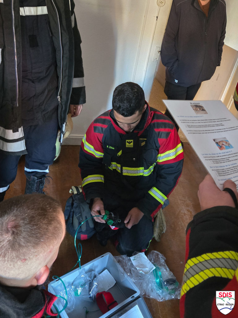 Un chat et un chien, fictivement intoxiqués, ont été sortis du sous-sol par les porteurs. Les intervenants ont revu l’utilisation du kit d’oxygène pour animaux ainsi que leur manipulation sécurisée jusqu’à leur remise au propriétaire ou au vétérinaire.