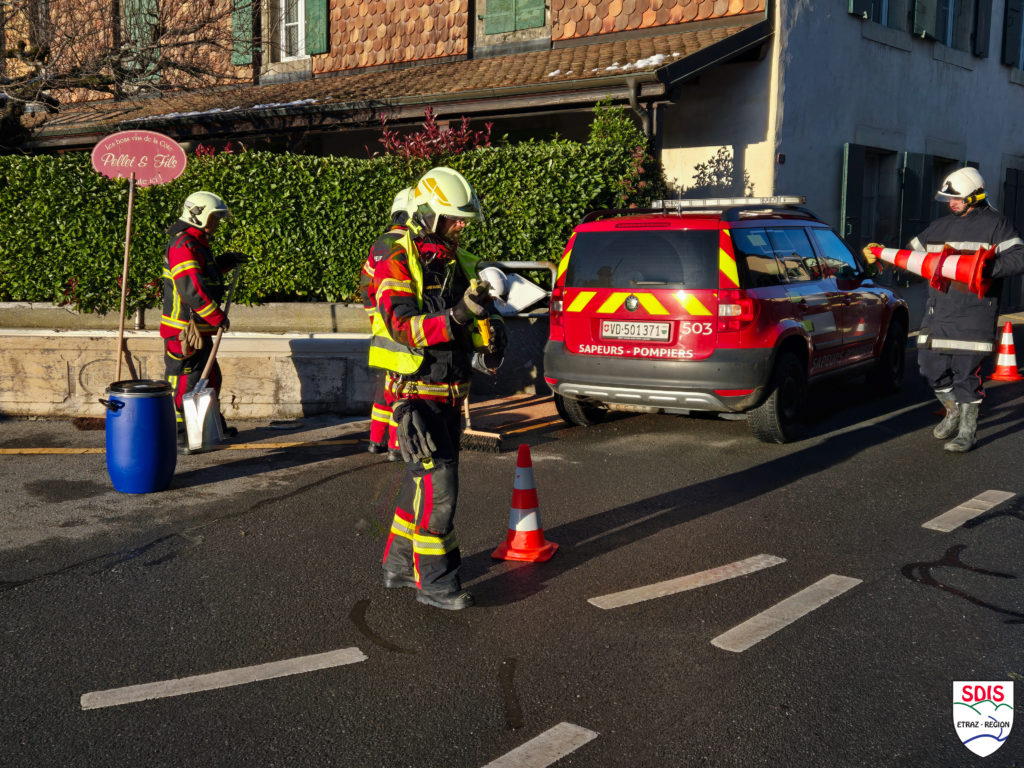 Les sapeurs ont débuté par la sécurisation d’un accident routier, avec traitement d’un écoulement d’hydrocarbure menaçant de rejoindre une grille d’eaux usées. Rapidité d’analyse et mesures anti-pollution étaient au cœur de l’exercice.