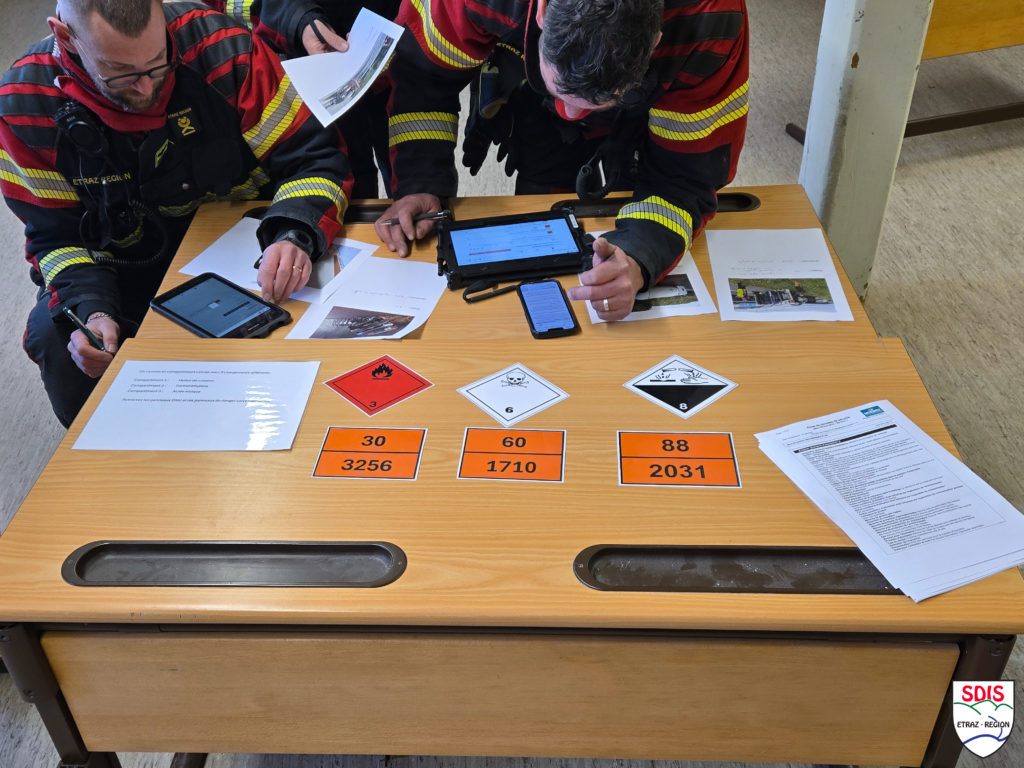 Sous forme de jeux didactiques, une révision des matières dangereuses a permis aux équipes d’utiliser à la fois le matériel pédagogique et la tablette véhicule pour identifier numéros ONU et produits impliqués.