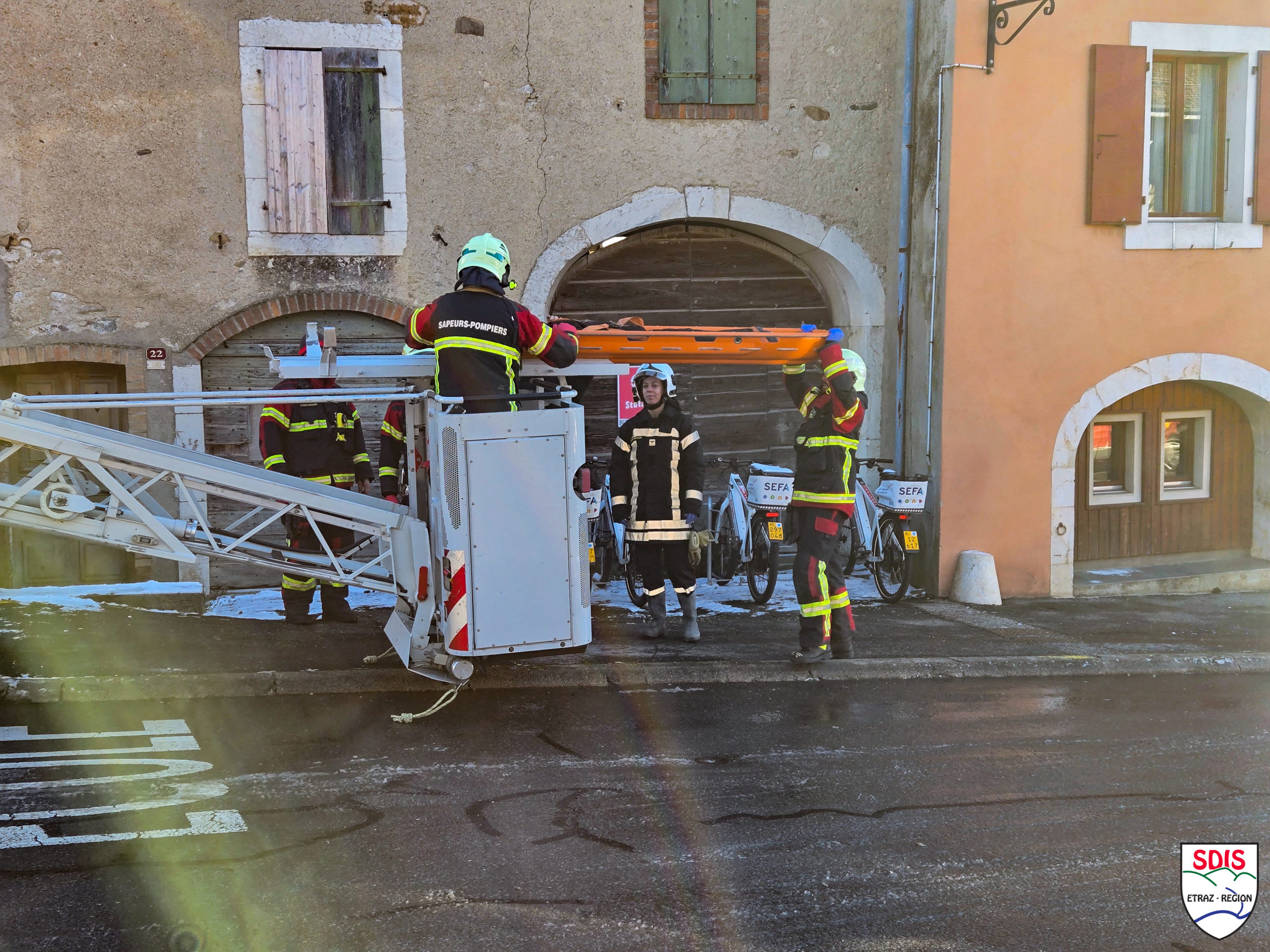 Depuis le deuxième étage du bâtiment, les sapeurs ont procédé à l’évacuation d’un mannequin en situation d’invalidité, à l’aide de l’échelle automobile. Un exercice essentiel pour maintenir la maîtrise des sauvetages verticaux.