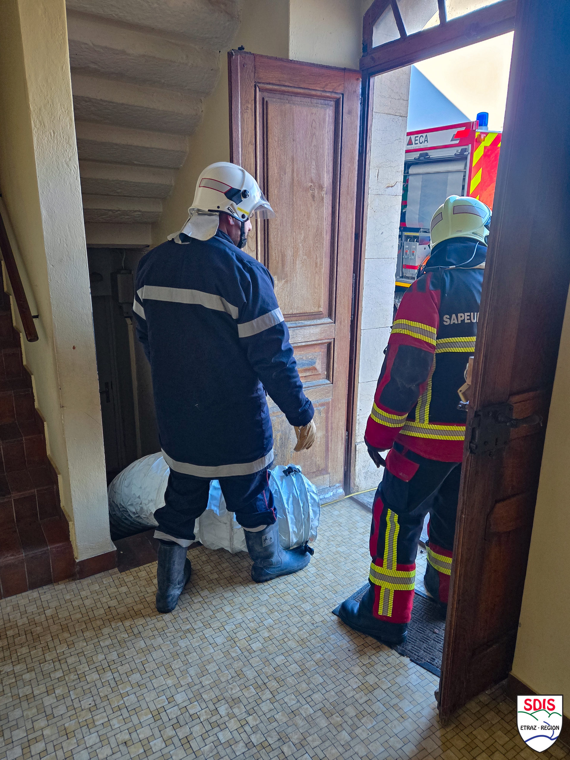 Un chat et un chien, fictivement intoxiqués, ont été sortis du sous-sol par les porteurs. Les intervenants ont revu l’utilisation du kit d’oxygène pour animaux ainsi que leur manipulation sécurisée jusqu’à leur remise au propriétaire ou au vétérinaire.